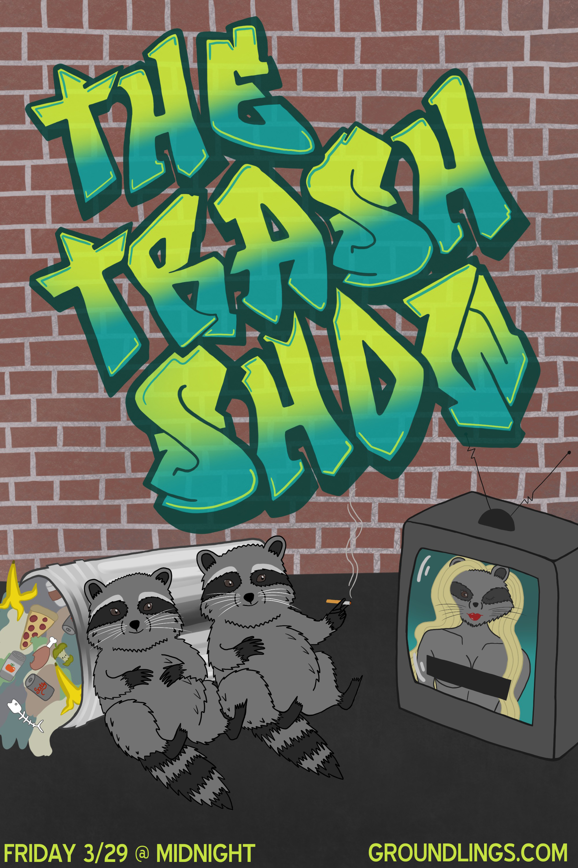 The Trash Show is a very special sketch show that appears at The Groundlings annually. As you can guess from the name, it’s pretty filthy, and there’s a reason you have to be 18 or older to attend. I had the honor of designing a new poster for the show in the beginning of 2019. I had a pretty clear idea of what I wanted to do with the poster, because what do people think of when thinking of trash? Good old trash pandas, of course! And I had to have them leaning against a dumpster in an alley whilst smoking cigarettes and watching raccoon porn.