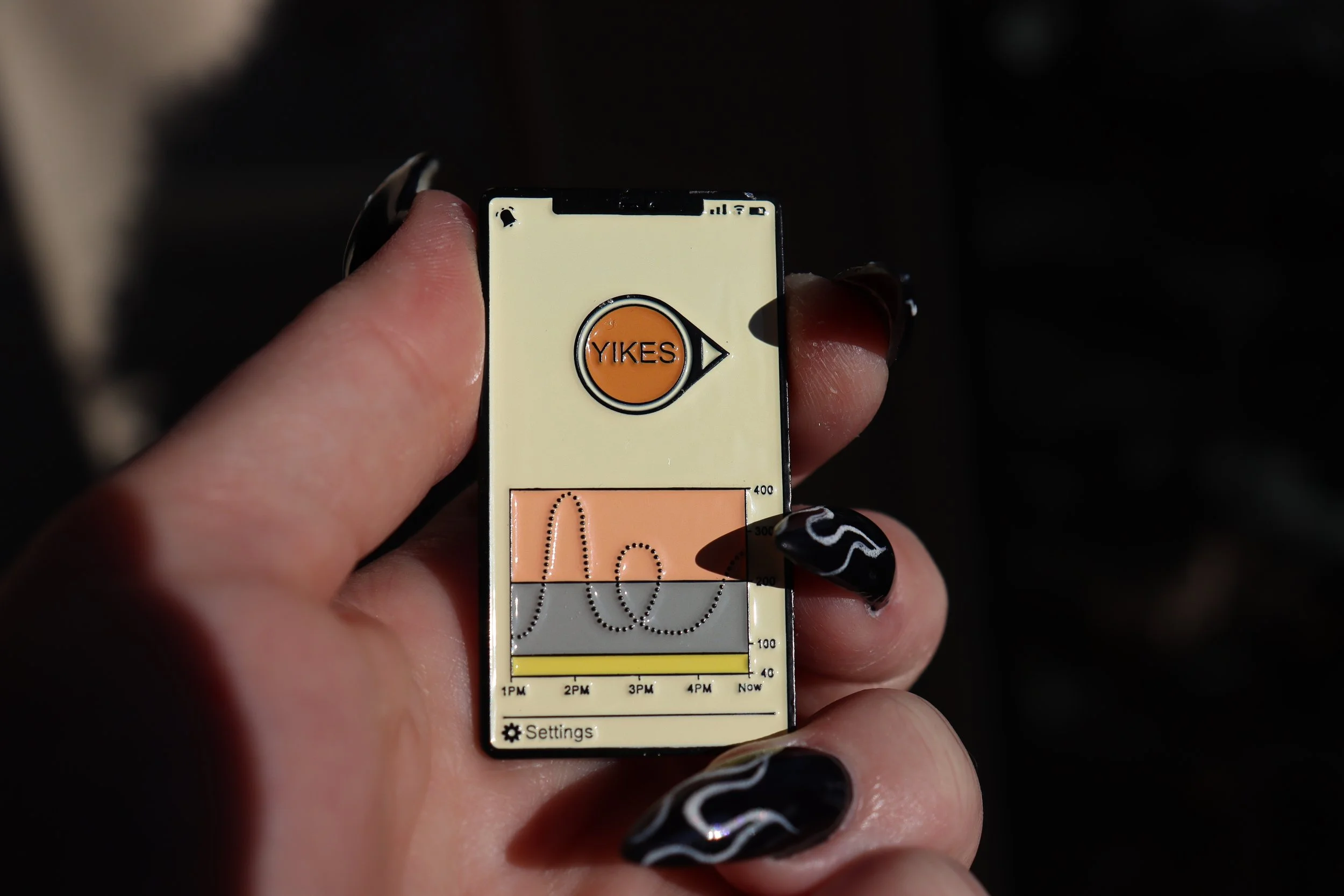 A pin of my illustration, “Yikes.” If you have a continuous glucose monitor, this is for you!